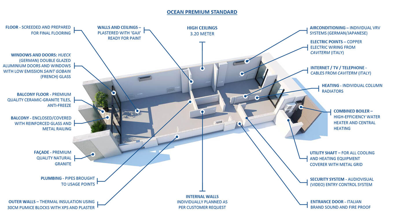 A typical Ocean client will not be satisfied with the limitations provided by a ‘turn-key’ solution, they want to create and live in a unique customized environment. The Ocean Premium Standard already provides a full scope of materials, equipment and customized services, such as individual planning of walls and provides the buyer with an apartment that needs a finishing touch create a unique environment and make it ready to move in.